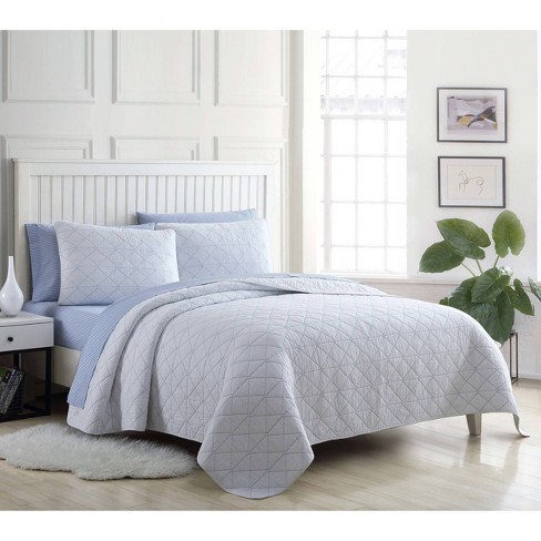 A sophisticated palette of grey and white is accented with ocean blue and sand, echoed in the striped reverse print. Give your sleep suite a stylish finishing touch with this nina quilt set from vcny home. The set also includes two pillow shams, one for twin size. Included shams feature an easy overlap closure The reversible paris night comforter is pretty, but thin. From classic white cotton for a clean, minimal look to solid tonal coloured designs for a modern, contemporary aesthetic to unique patterns adding personality into your bedroom, let us impress you with our stunning array of doona covers. Quilt set is constructed with soft 100% cotton and is machine washable for easy care. The izod evan microfiber quilt and sham(s) feature patchwork striped and solid patches in hues of white, blue, gray and indigo on the front and both reverse to solid denim fabric. The mainstays coordinating comforter set & quilt set full/queen comes with two pillow shams, two decorative pillows that coordinate, so you can switch it up if you'd like to.